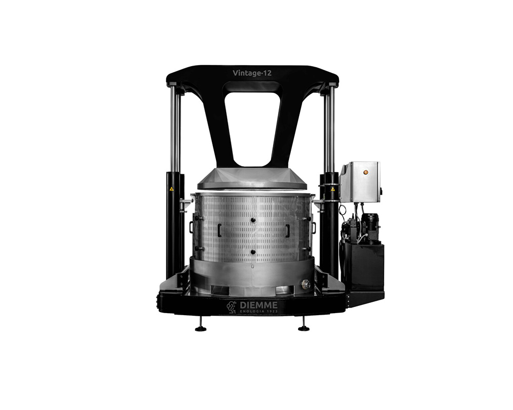 State-of-the-art technology and design expression for a modern solution based on the best of wine-making tradition. The vertical hydraulic press is composed of a mounting plate and head made of painted steel connected by pressing cylinders. This configuration helps in making the pressing uniform and it allows to limit the size during the transport.
